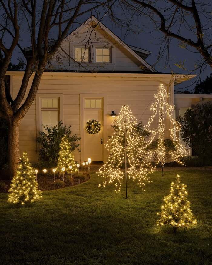 The wire trees on poles feel like sketches floating in the air. They shine because there’s space around them. Start with three sizes. Tall near the path, medium close to the door, and small toward the viewer. That creates depth without adding clutter. Add a small wreath at the door, maybe no bow, or one tiny velvet bow so the trees get the spotlight.