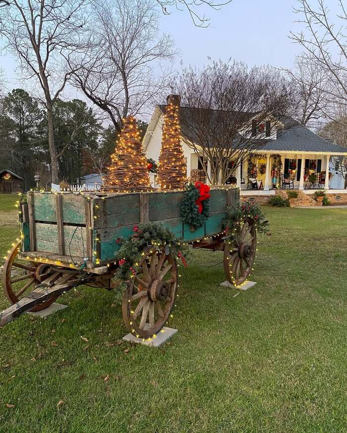 This vintage wagon made my heart do a tiny yeehaw. The patinaed wood, the wreath on the back rail, and two grapevine cones wrapped in lights feel like a traveling story. If you don’t own a wagon, use a wheelbarrow or potting bench. Wrap the edges with micro LEDs, drape faux cedar along the top, and place the grapevine trees at two heights. Hide bricks in the bases so they don’t tip.