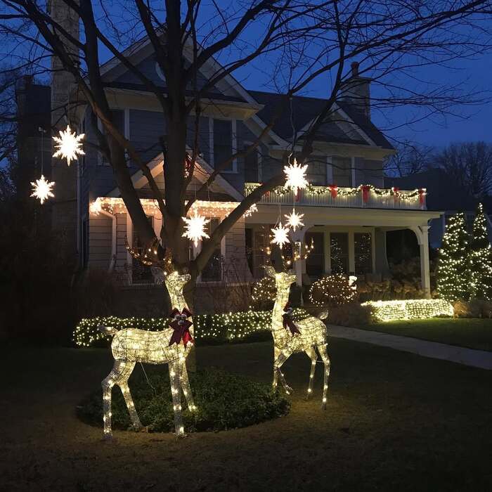 For photos, add a tiny uplight at the trunk to wash out any visible cords from the stars. Put the stars and deer on the same smart plug so they click on together, which feels theatrical. If you want color, choose warm gold stars and keep the rest in warm white. That way it still feels cohesive. This scene is flexible outdoor holiday decor for almost any yard since it builds up, not out. I store each star in a gallon bag so it never tangles again. Learned that one the messy way.