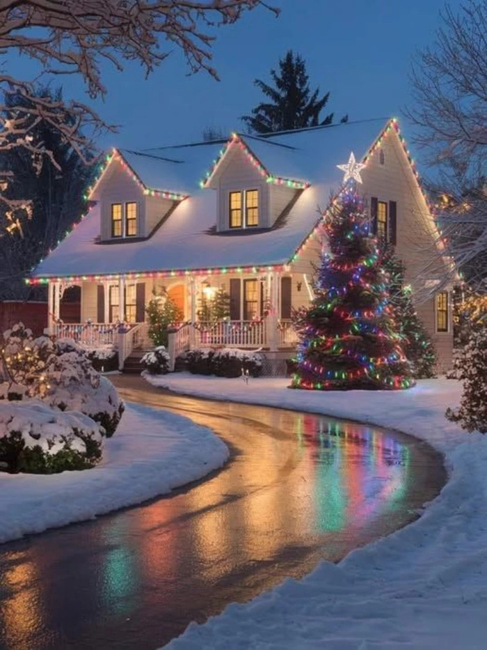 Those C9 bulbs around the roof reflecting on the wet driveway look like candy. Outline the roofline and porch with clips spaced evenly so everything feels tidy. Plant your biggest tree near the bend of the drive and wrap it from trunk to tip. I spiral the trunk first, then zigzag the branches. Keep the bushes either dark or simple warm white so the multicolor tree gets to be the star.