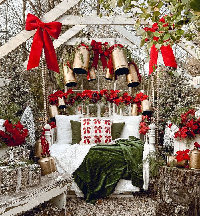This nook is comfort in a frame. A painted bed swing, thick pillows, a deep green throw, and a row of metal bells tied with red ribbon across the rafters. Every wind gust makes soft chimes, which gave me a weird happy feeling I can’t explain. Line the back with faux garland and tuck in poinsettias like frosting. Two small lit trees in crates anchor the sides.