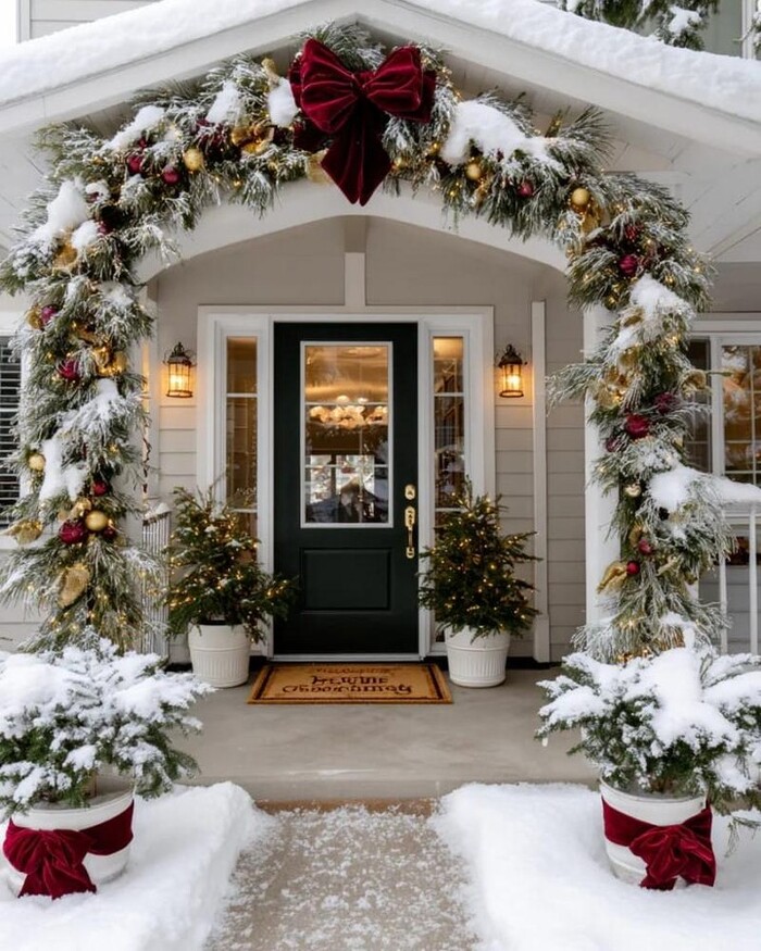 Place two potted trees at the base wrapped with white fabric and tie each with a red bow for a gift feel. Run all lights in warm white so the snow reads creamy, not blue. This is elegant exterior holiday decorations that photographs beautifully at dusk. Hide the cord junctions inside the planters. If you want to go bigger later, add matching swags on the railing. The arch does the heavy lifting, so the extras can stay small.