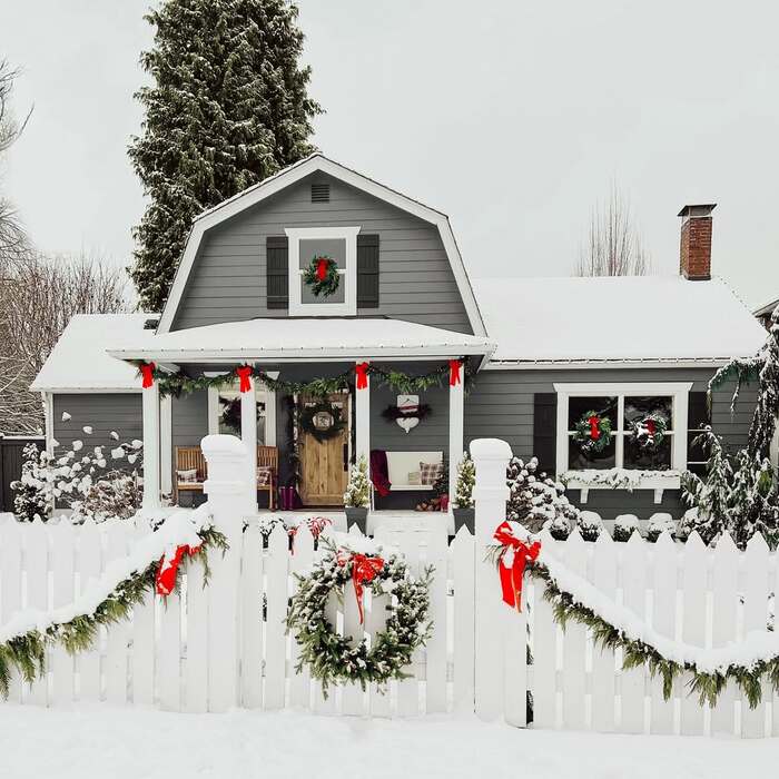 The white picket fence with draped garland and red bows is small-town perfect. Keep the swag long and loose across the fence, then place bows at each post for rhythm. A wreath centered on the gate acts like a welcome button. On the porch, hang a garland under the eaves and pop a slim tree in the corner to keep scale delicate.