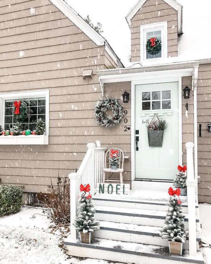 This little house with a mint door and tiny trees on the steps made me melt. Proof that simple outdoor christmas decor can still feel magical. Place two mini trees in square planters at the first step and dust them with faux snow. Tie bright red bows so they pop against neutrals. On the stair, a NOEL sign adds charm. I DIY mine with wood letters on a board, then wrap a thin battery strand around the edge for a soft halo.