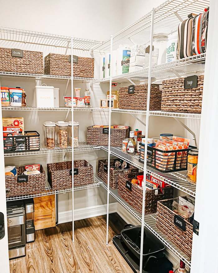 Those woven baskets you see everywhere are not just cute. They hide visual clutter and stop odd shaped bags from falling over. In a wire-shelf pantry, baskets also keep tiny spice jars from tipping through the gaps.