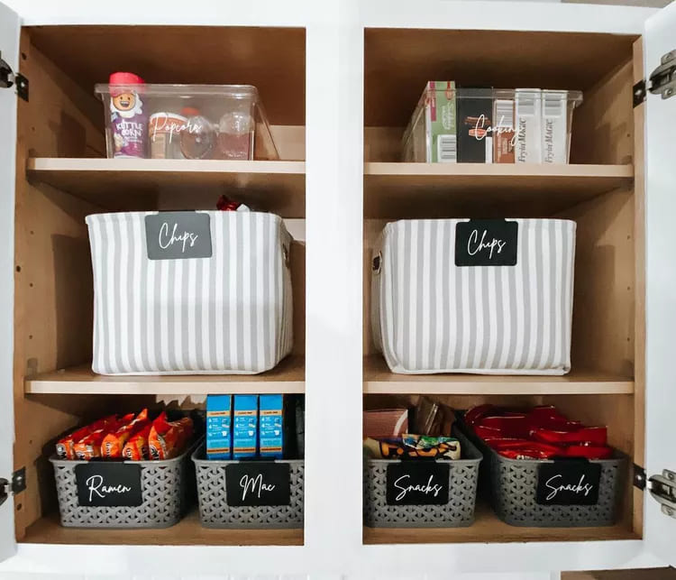 The best spaces split food by use, not by package size. Make five simple zones: snacks, baking, breakfast, dinners, and backstock.