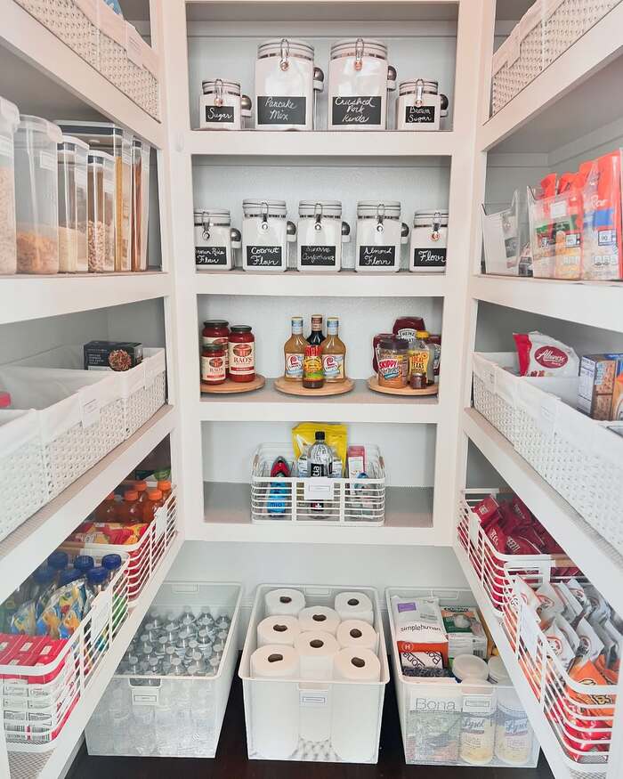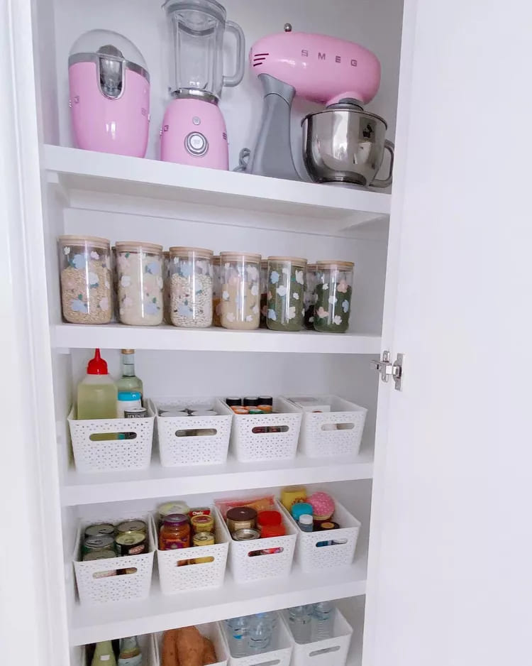 Tall, narrow cabinet pantries scare people. They shouldn’t. This one uses adjustable shelves and medium white bins to collect categories. Put the heaviest stuff at hip height so you’re not lifting sugar over your head. Pasta and cereal in clear containers mean you can see when you’re low.