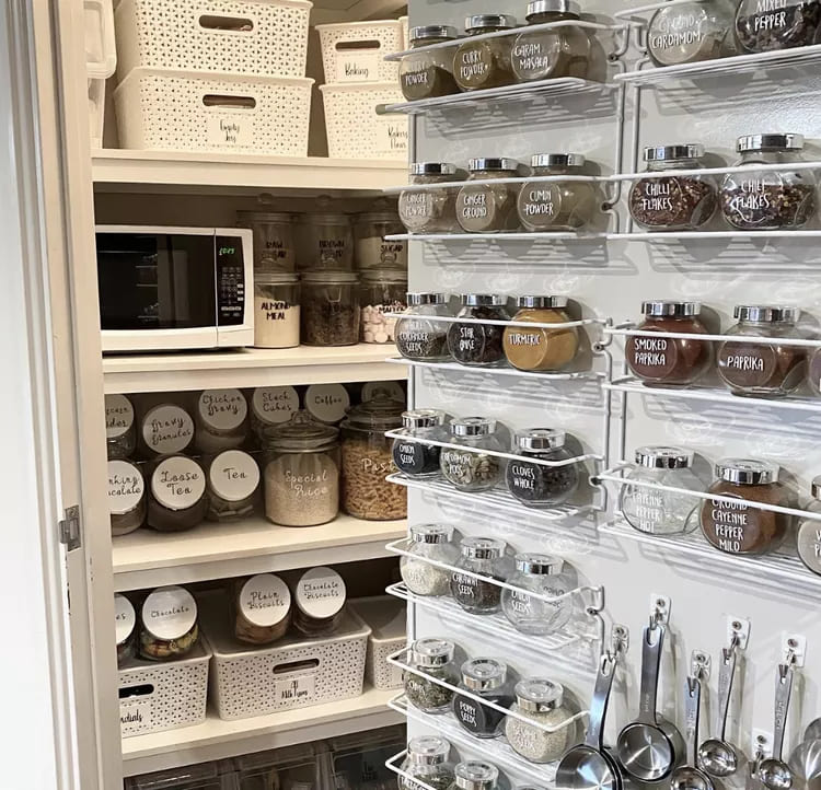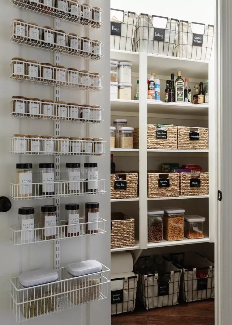 Spices lined up on the door with matching labels. Baskets inside holding categories like “granola bars” and “condiments.” This is a layered system, which is why it lasts. Door equals small items. Shelves equal grouped bulk. Floor equals backstock.