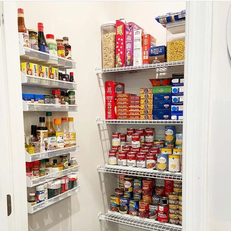 I love the “grocery store” look here. Tiered risers for cans, big cereal containers, and door racks for sauces. If you ever lose cans to the back of the shelf, install one more riser. Stacking two creates a stadium seat effect so nothing hides.