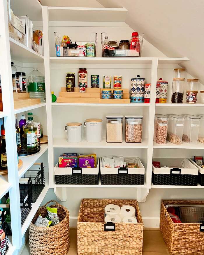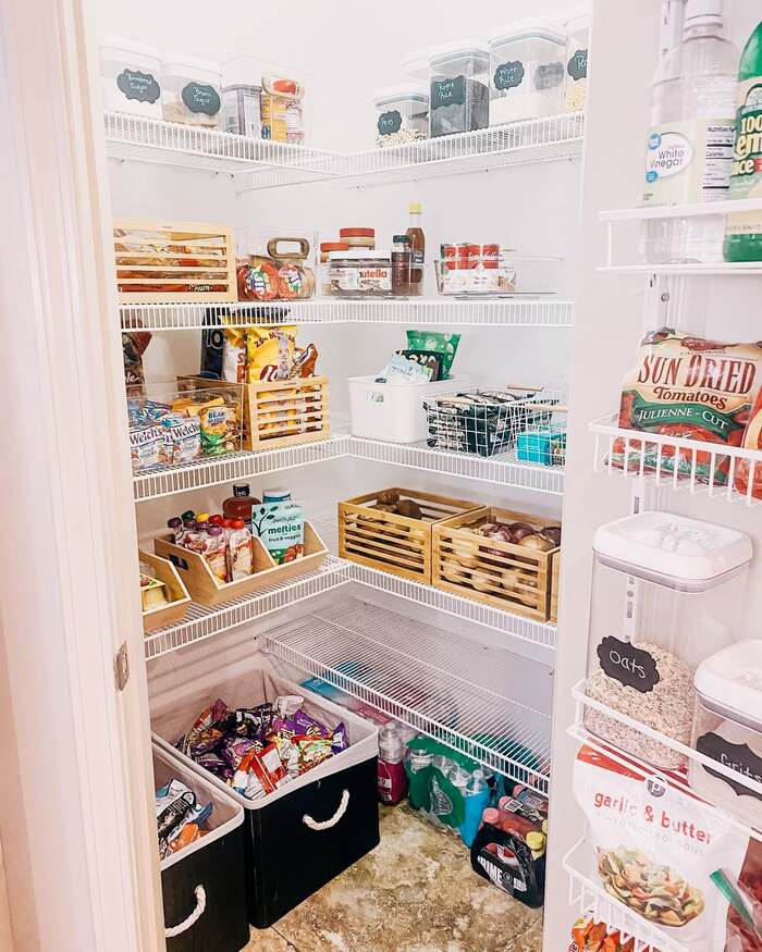 Wire shelves get a bad rap, but this one nails it. Mesh liners stop tip-overs. Big woven basket on top corrals paper goods. Decanted cereals, nuts, and snacks keep pests away. If you have wire shelves, use bins with solid bottoms and add lazy Susans for bottles.