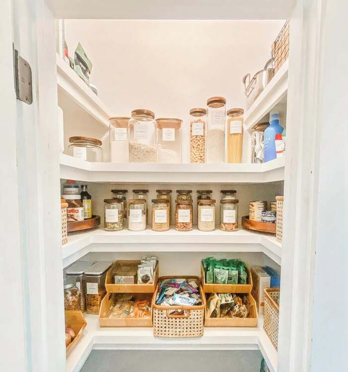 Use airtight canisters with wide mouths so measuring is easy. Everything else can live in labeled bins. Saves time and still looks calm.