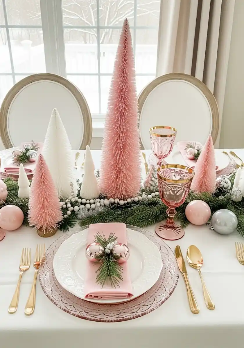 Pink and Gold Christmas Decor: Frosty Tablescape With Bottle-Brush Forest