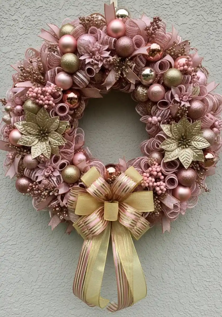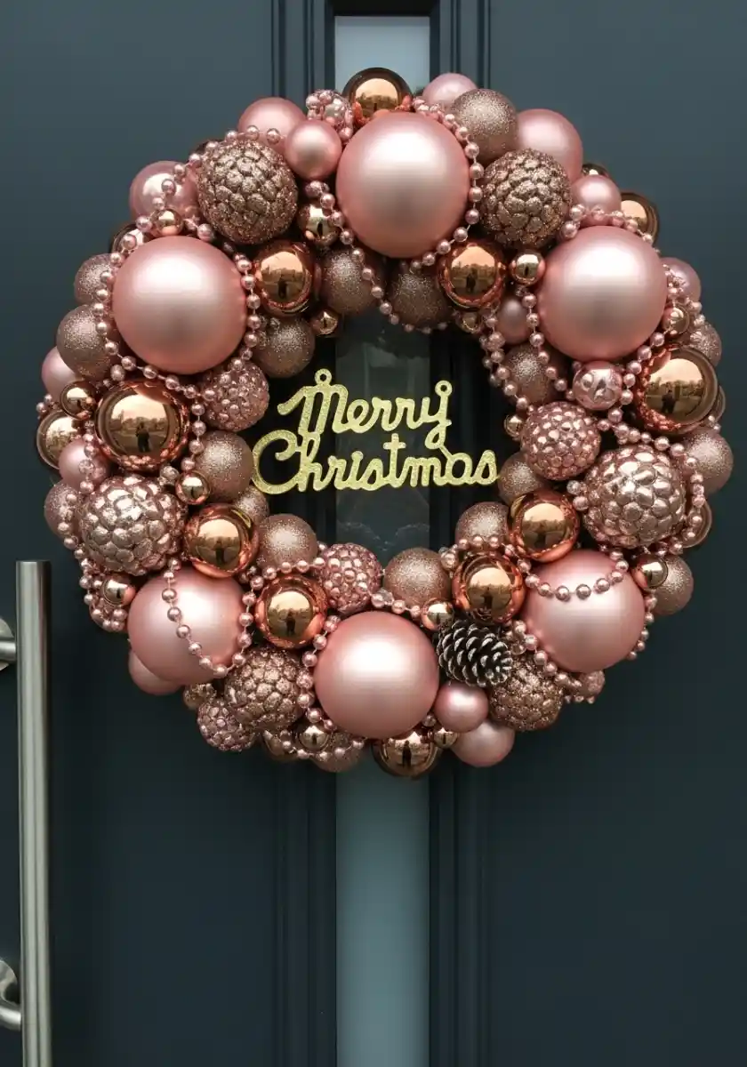 Finishes are key. Mix matte blush, glossy rose gold, and textured champagne. One little pinecone grounds all that shine. This wreath is pure pink and gold christmas decor energy before anyone walks in. If your door is also dark, you’ll get that high contrast pop. For a softer look, hang the same wreath on a mirror inside the hallway. It reflects the lights and doubles the sparkle.