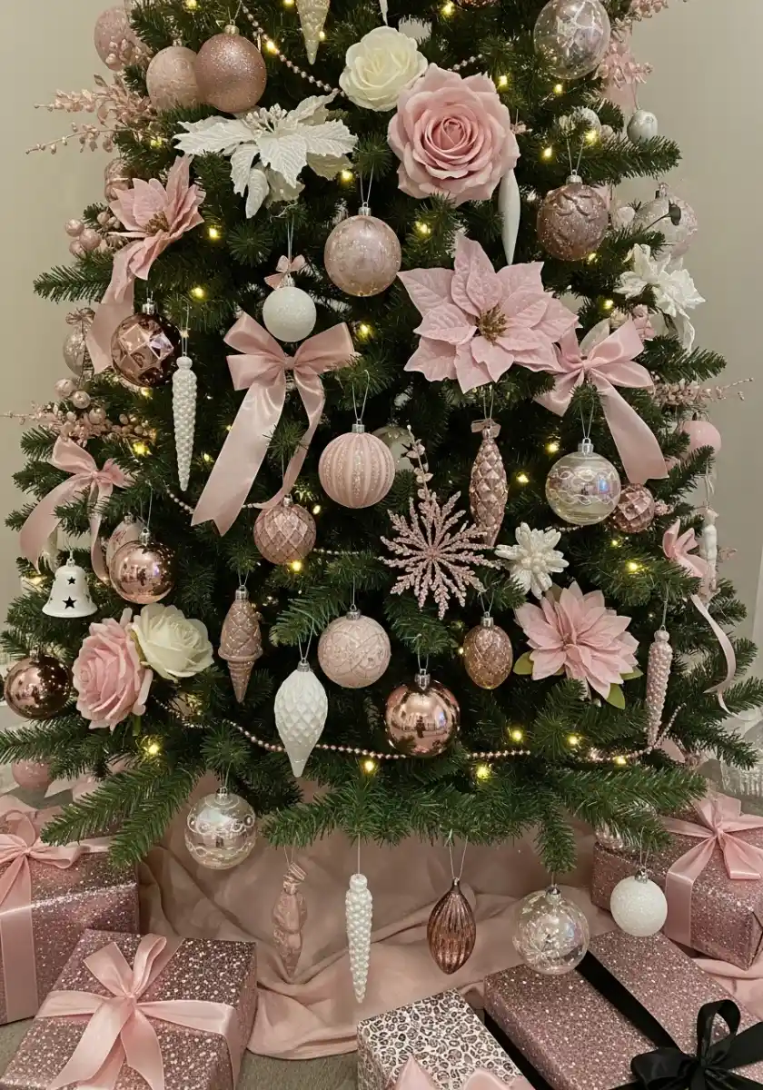 Pink and Gold Christmas Decor: Floral bow tree with mix-finish ornaments