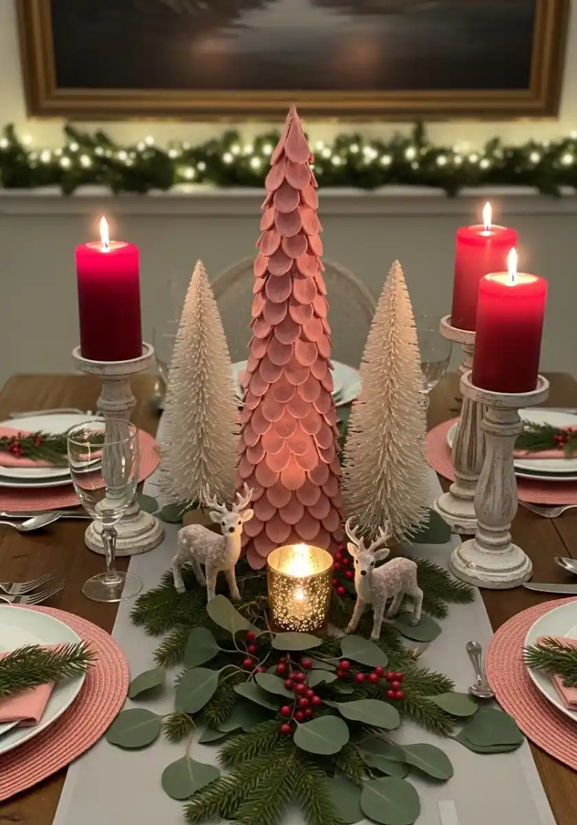 This table feels like a gentle carol. A tall pink cone tree anchors the center, then two creamy bottle-brush trees flank it. Around the base I lay fresh greenery, eucalyptus leaves, and a few red berry picks so it doesn’t turn too pastel. Four chunky candles on distressed holders bring real warmth. I love the soft flicker on glass chargers and the simple napkin with a mini sprig tied in twine. Easy, cozy, still glam.