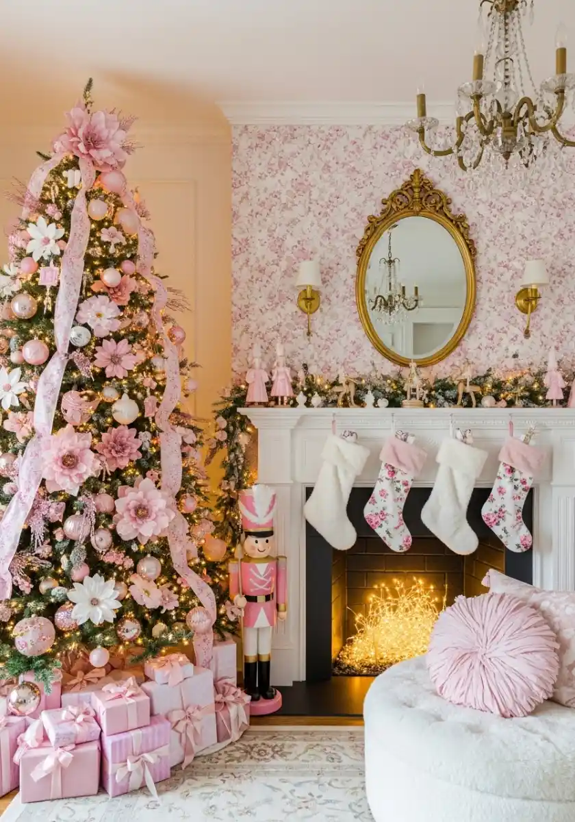The color palette stays blush, cream, and warm gold so the pink and gold christmas decor thread runs through the whole room. Add a nutcracker, a couple gnomes, and a mantel sign. I love mixing matte pink ornaments with mercury glass for that old-meets-new look. If you need durability, go shatterproof on the lower half of the tree. Variations include blush pink and gold ornaments, pastel pink and gold decorations, and pink and gold holiday stockings.