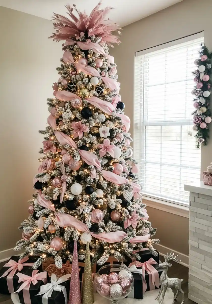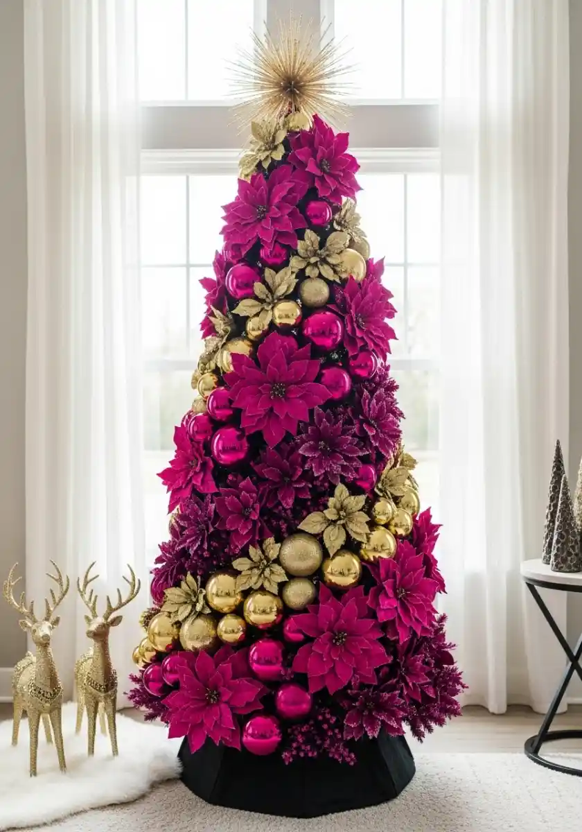 This version stretches the pink and gold christmas decor family into richer territory. If magenta feels too strong, slide back to deep rose. Keep the base black or dark to ground all that shine. Two gold reindeer on a fluffy rug beside it add a wink of humor. Try calling this style magenta and gold Christmas decor or rose gold and pink holiday tree for your notes. It’s bold, fun, and photographs like a dream.