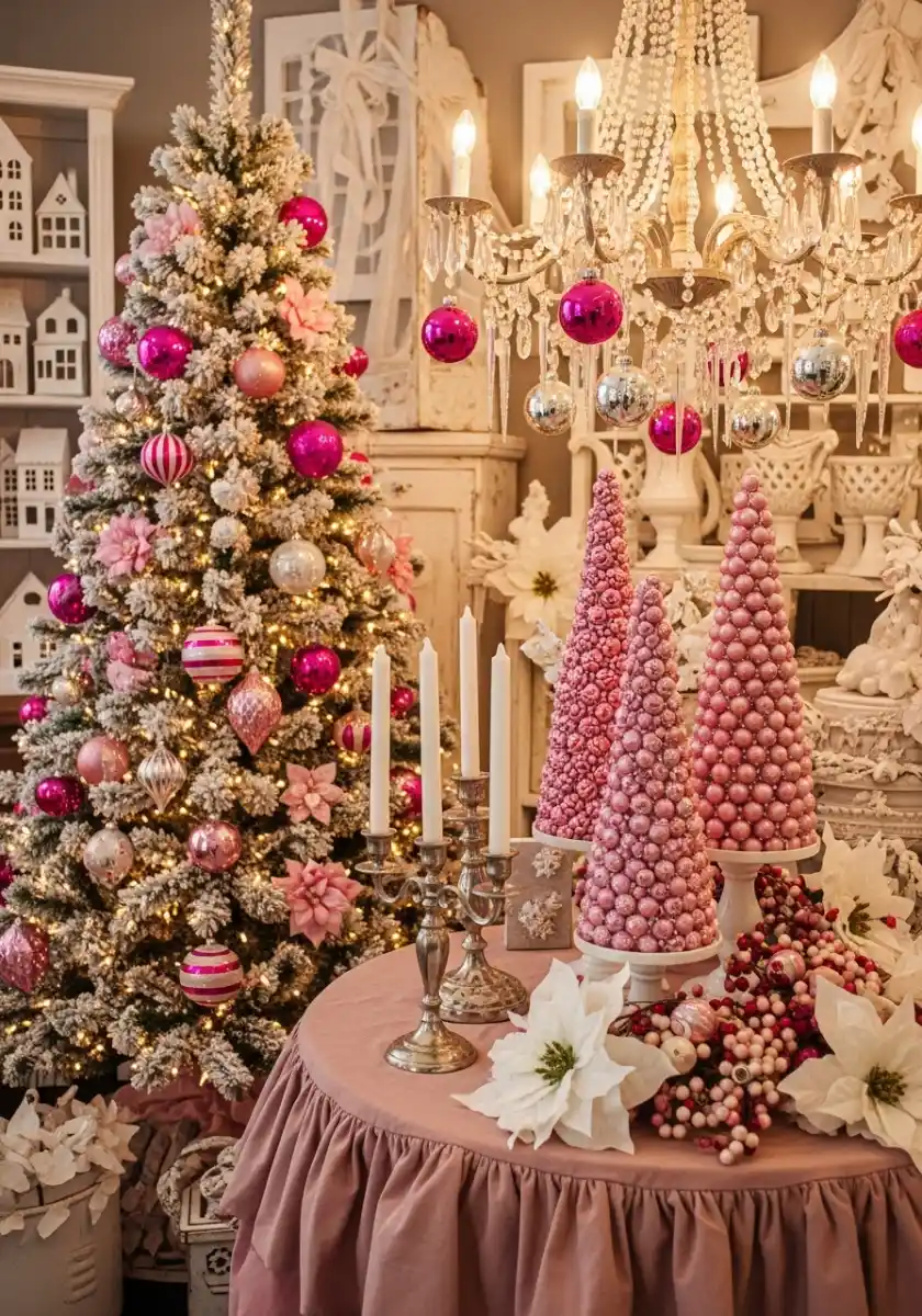 This scene is party ready. The chandelier wears shiny ornaments, the frosted tree holds stripes and hot pink balls, and the table shows three ornament cone topiaries on cake stands. I love how the bright pink wakes up the soft blush. Use it like a spice. I hang the bold color in the middle third of the tree so it doesn’t drag the eye down. The rest stays champagne, pale pink, and pearl.