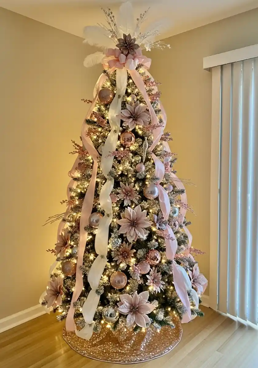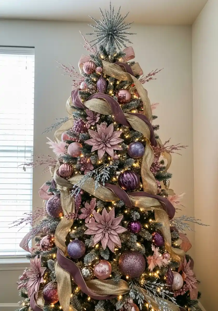 This tree grabbed me first. Big blush poinsettias, shiny mauve and lavender ornaments, and two ribbons running like rivers one champagne gold, one deep plum. The contrast is dreamy. I anchor ribbon tails near the trunk with green pipe cleaners, then let the ribbon billow back out. That pinch-and-pouf trick gives you those chunky S curves without fighting the branches. The starburst topper finishes the glam but doesn’t steal the whole show.