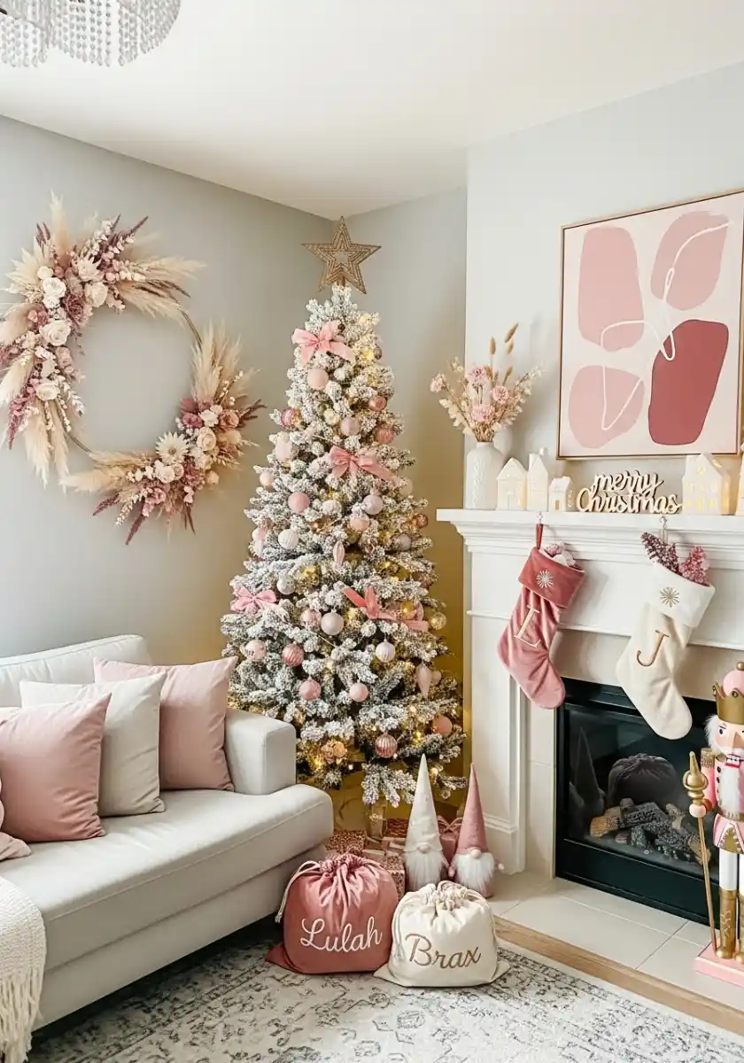 This idea is cheerful and family friendly. A flocked tree wear small bows, pale baubles, and warm lights. On the wall, a big wreath with pampas grass and soft florals adds texture without shouting. I place a simple star on top and keep the gifts in soft fabrics bags so kids can squish them and nobody cries.