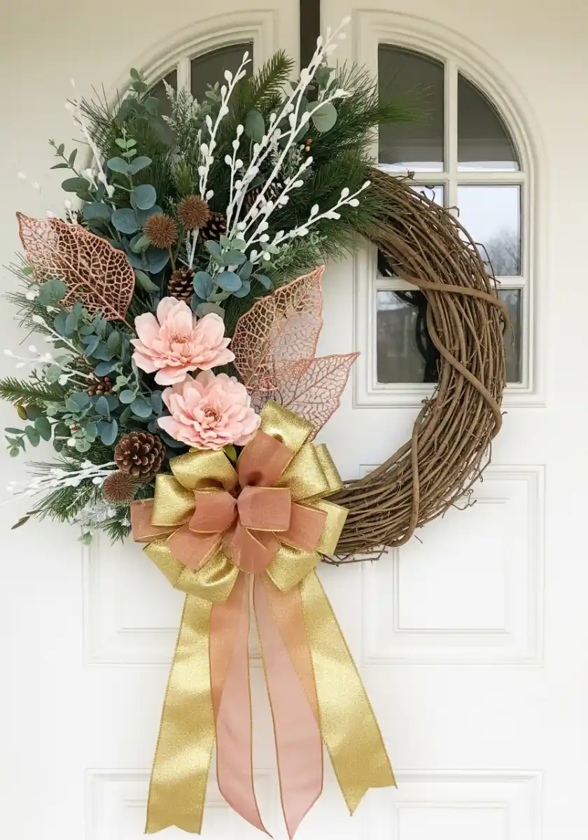This wreath is rustic glam in the best way. A grapevine base holds eucalyptus sprigs, evergreen picks, and two blush blooms. Metallic skeleton leaves and a big double bow in satin pink and glitter gold finish the look. I build it off-center so there’s negative space on the right. It feels modern and not stuffy.