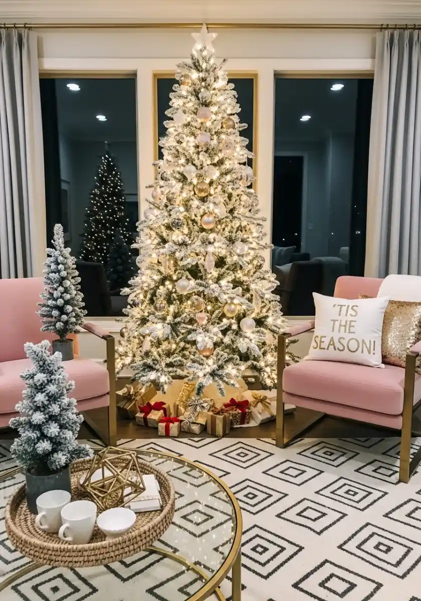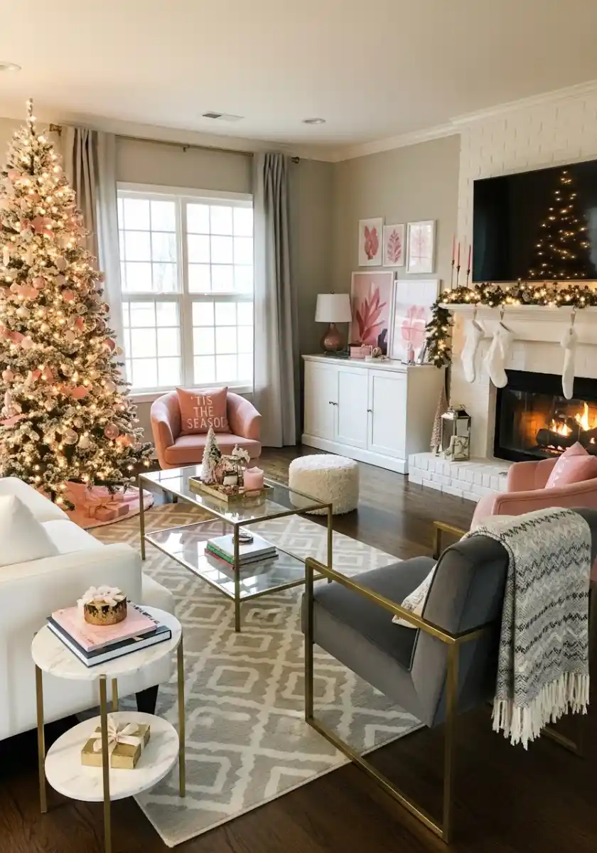 Design basics that matter here. Repeat finishes in at least three places. Brass shows up in the lamp, tables, and picture frames. Pink appears in chairs, ornaments, and art. That’s why the pink and gold christmas decor scheme looks intentional. If your room leans gray, add warm bulbs in the lamps to stop the palette from feeling chilly. Variations that fit this space are pink and gold Christmas decorations with brass, blush and gold decor with modern lines, and pink & gold holiday decor for living rooms.