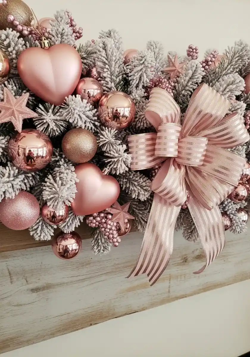 This garland idea is flirty and festive. Frosted greenery meets matte blush ornaments, a few heart shapes, and a striped pink bow. It’s very romantic without getting sugary. I fluffed the branches forward so the ornaments sit proud. That little move makes budget baubles look like luxury. If your garland looks flat, tuck in extra picks like berry sprigs and glitter stars, even thrifted ones work after a quick spritz of soft gold spray.