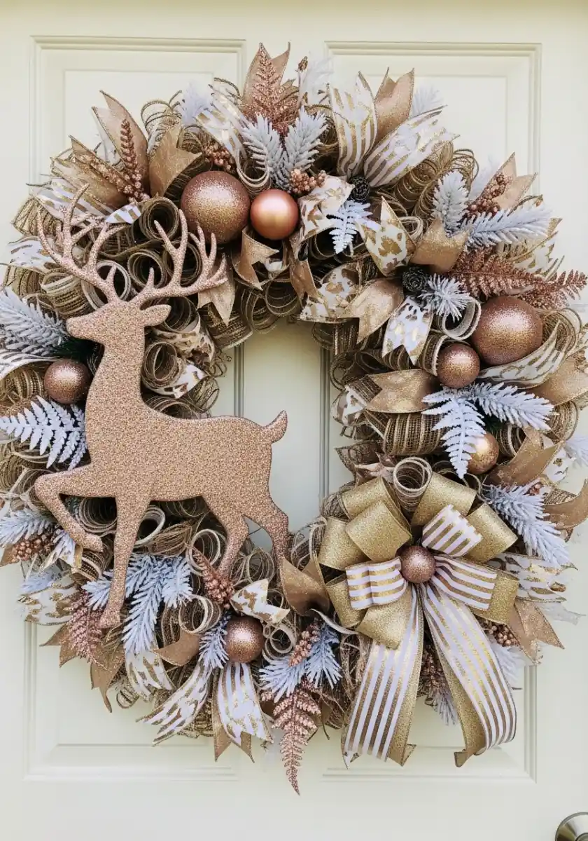 This wreath is a welcome hug. Loops of gold deco mesh and striped ribbon create volume, then rose gold ornaments and frosted ferns fill the gaps. The glitter reindeer silhouette sets the story without words. I build it off center so the bow and reindeer balance each other. If your wreath looks heavy on the bottom, tuck a mini cluster near the top left to pull the eye upward.