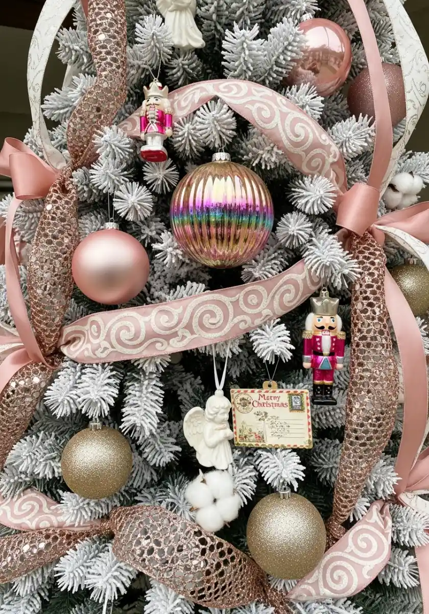 Close up, the details are so pretty. A flocked tree gets three ribbons satin blush, sheer pattern, and a lacy rose gold mesh. I weave them in a loose braid. Not tight. Loose so it breathes. Then I hang small nutcracker ornaments, a ceramic angel, a cotton sprig, and a rainbow ribbed bauble as the wildcard. That one quirky ornament keeps it from feeling matchy.