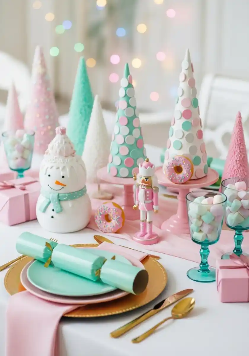 This tablescape is pure fun. Mint, blush, and white cone trees line the center, with a cute snowman and a tiny pink nutcracker standing guard. I set plates in mint and blush on top of a gold charger so the color reads from far away. Teal goblets bring freshness. A simple napkin drape and a party cracker on each plate turns dinner into a playful moment. Kids go wide eyed. Adults too honestly.
