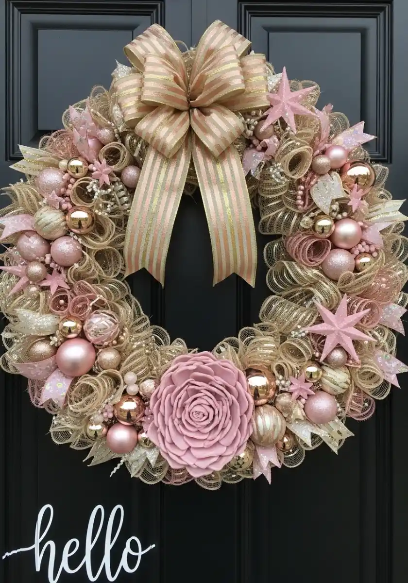 Welcome idea number five a plush wreath packed with mesh curls, blush ornaments, and a giant striped bow. A sculpted pink rosette sits at the bottom like icing on a cake. To build it, I alternate ornament sizes, then tuck little star picks and pearls to fill tiny gaps. The trick is repeating textures glitter next to smooth next to pearl so the eye keeps moving.