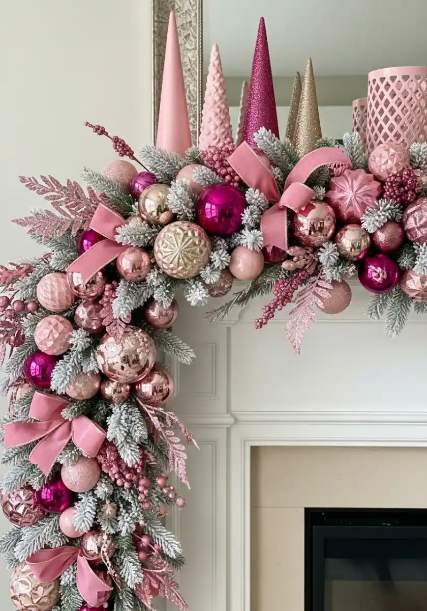 The color story here is what sells it. Think rose gold Christmas decorations meeting ballet pink berries. I used three finishes glossy, matte, and glitter to catch the lights in different ways. If the mantel runs long, repeat the bow on both ends to balance the weight. Don’t skip the command hooks under the edge, they hold the swag shape. This is gentle glam, a super easy version of pink and gold christmas decor that still feels special.