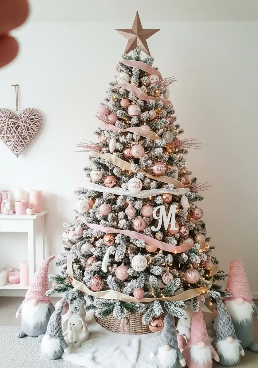 At the base, a basket collar feels natural and hides the stand, such a small change but it neatens the whole look. And yes, those little gnome friends are goofy in the best way. They stop the tree from feeling too perfect. If your lights look cold, switch to warm white to soften the rose tones. This is one of my favorite pink and gold christmas decor moves because it blends playful and grown up.