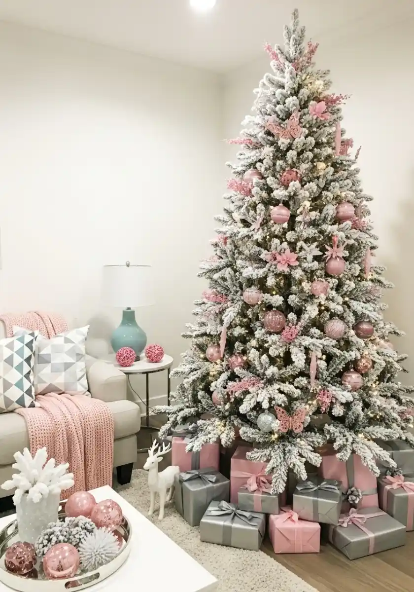 Here the tree mixes pink ornaments, light silver balls, and a few butterflies tucked in for whimsy. It feels like cotton frost. I layered ornaments from deep inside the branches to the outer tips so the lights glow through them. That trick makes even a budget tree look more expensive. At the bottom, wrapped gifts in pink and gray carry the color palette into the room.