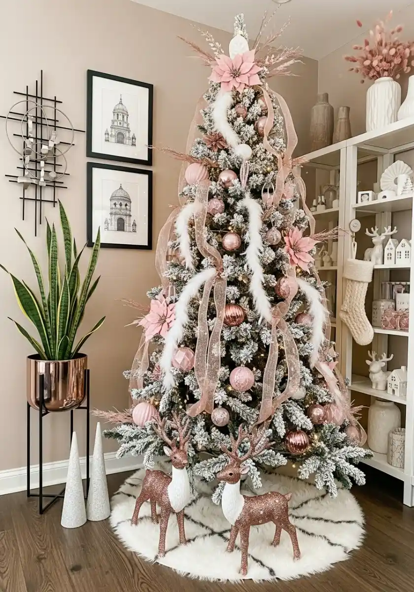This look is drama in the nicest way. Tall flocked tree, airy ribbon streams, soft white feather picks, and rose gold ornaments with different ribbed textures. I used ribbon in two widths so it doesn’t feel flat. The feathers are the magic. They catch the lights and read like winter clouds. On the floor, a white round rug creates a stage for two glitter reindeer, which is adorable and also makes kids gasp.
