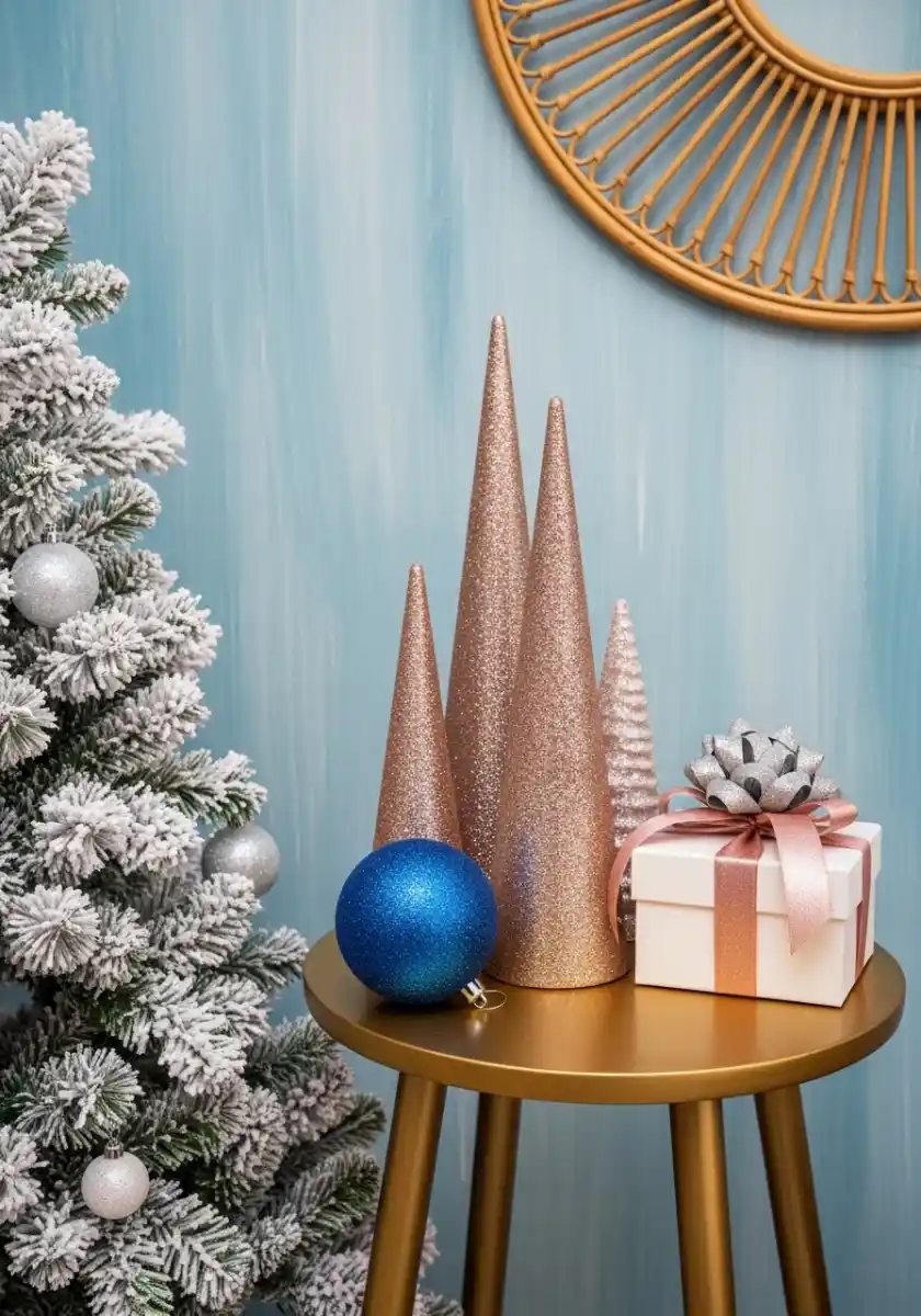Sometimes you only need a corner to feel festive. On a small gold table, I grouped glitter cone trees and added one bold blue ornament. That tiny color shock keeps the pinks from getting syrupy. Place a small gift box with a satin pink ribbon to finish the story. I love this setup for entry tables, kitchens, even a bedroom.