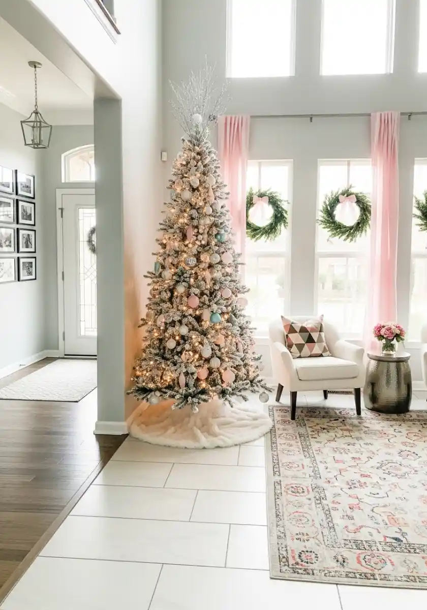 This idea makes guests gasp before they even drop their coats. A slim flocked tree glows in the foyer, while three wreaths hang in the windows with soft pink bows. Pale curtains back it all, giving the blush ornaments a gentle stage. The rug pulls in muted reds and pinks so nothing clashes. I like a small side table with fresh flowers to echo the palette.