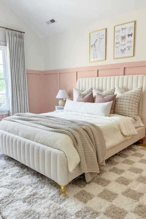 That blush board and batten halfway up the wall is a cheat code. It gives architecture even if your walls are plain. Pair with an upholstered bed in oatmeal, layered waffle blanket, and a check rug for softness. I love the gold feet on the bed, tiny sparkle, not loud.