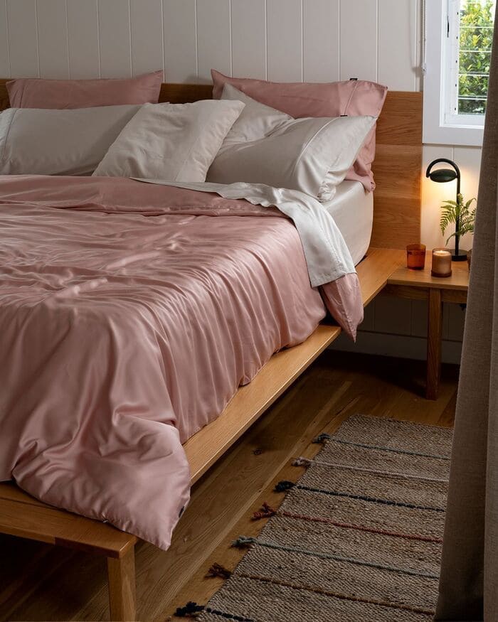 Satin or silk blush sheets on a wood platform bed feel like a hotel you maybe never leave. A small lamp, candles, and a textured rug with quiet stripes keep it adult. Heat warning from my mistakes, silk can slide, so use sheet suspenders under the mattress.