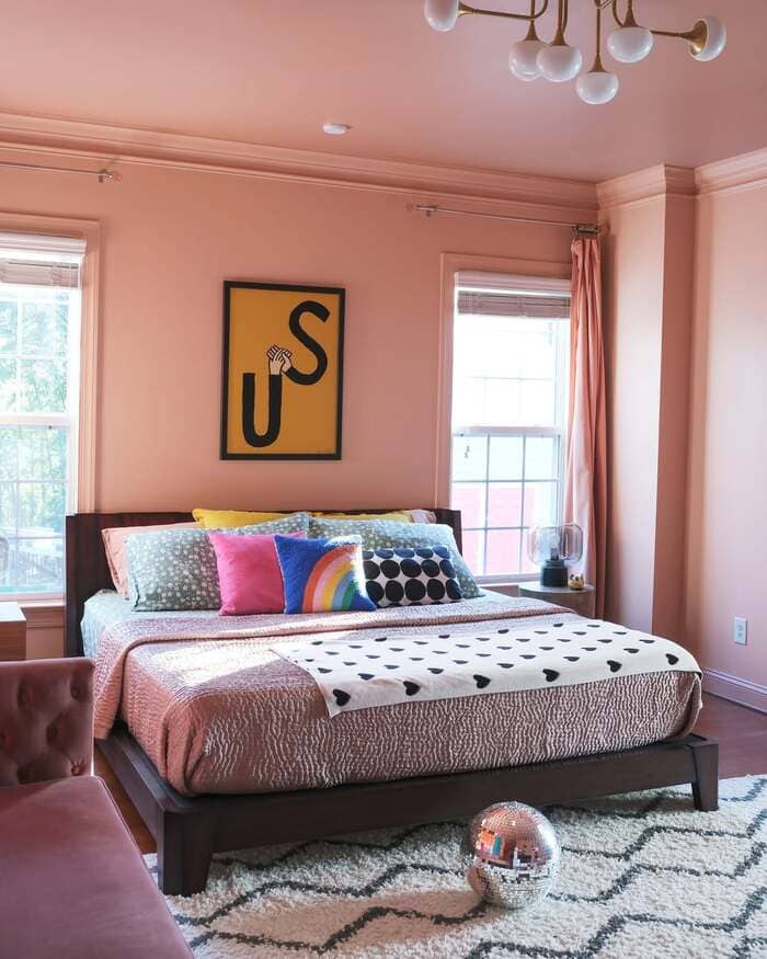 There’s a sunny room with peach walls and wild throw pillows. Joy town. If you love color but still want sleep, keep the bed base dark wood to ground it. Pick three patterns only.