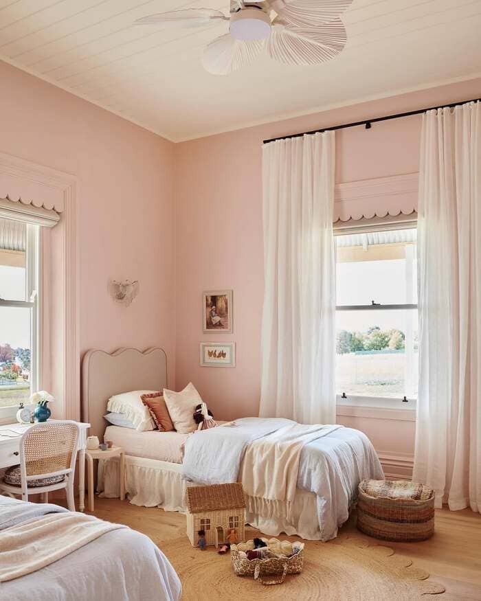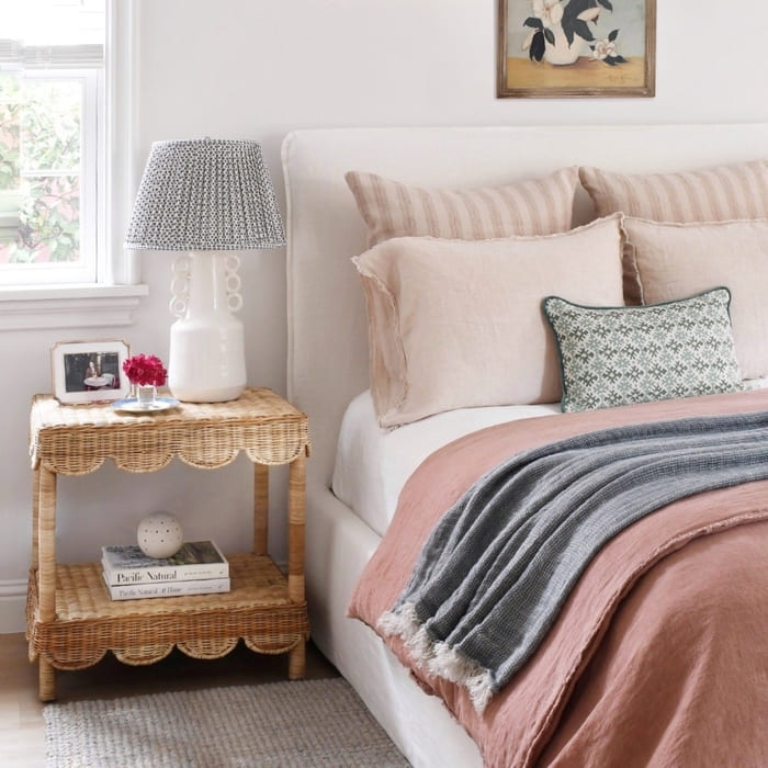 If you want pink that whispers, copy the bed with dusty rose linen and a scalloped rattan side table. The gray throw is doing a lot here, it chills the warmth and stops the palette from melting.