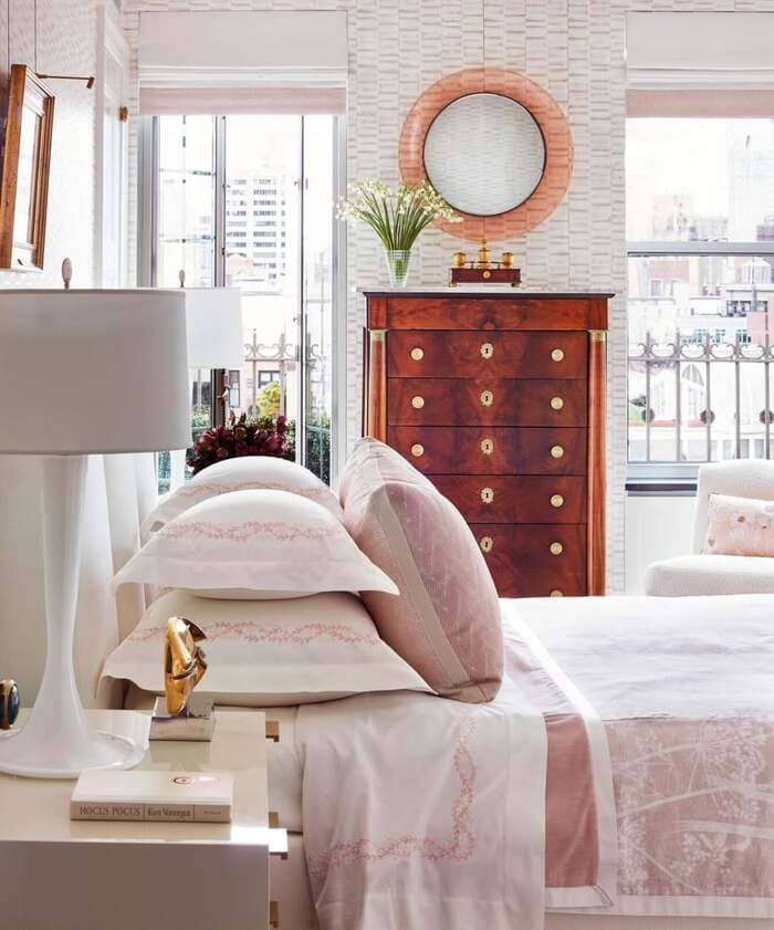 I can’t lie, the room with the tall mahogany chest made me grin. Old wood with pink is a power couple because the warmth of the grain balances the blush. Use embroidered pillow shams and a tailored coverlet so the look feels grown.