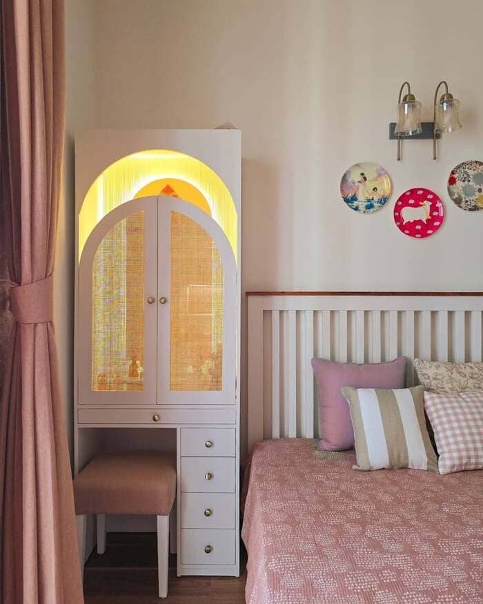 I’m obsessed with the little study nook that tucks beside the bed, with a lit arched cabinet. For small rooms this is gold. Build a mini workstation that doubles as a vanity and stash everything behind cane doors so the space stays soft. Use a blush quilt with micro pattern and mix pillows in stripe, gingham, and solid.