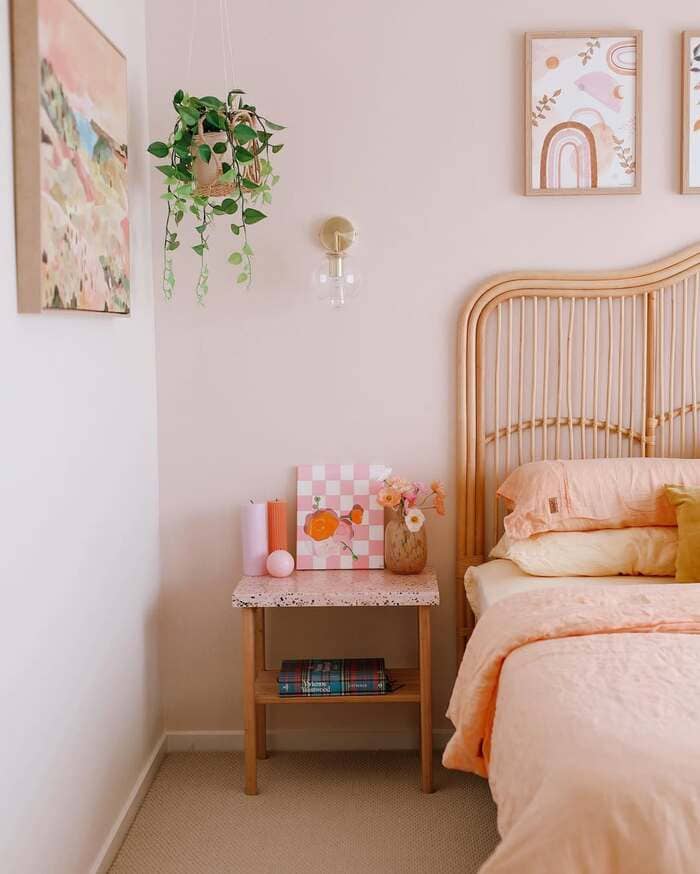 The room with the curved rattan headboard and terrazzo-topped table feels like summer forever. Walls are blush, bedding leans peach, and the art has friendly rainbow shapes. Keep metals warm, use brass or brushed gold, and hang one plant to bring movement.