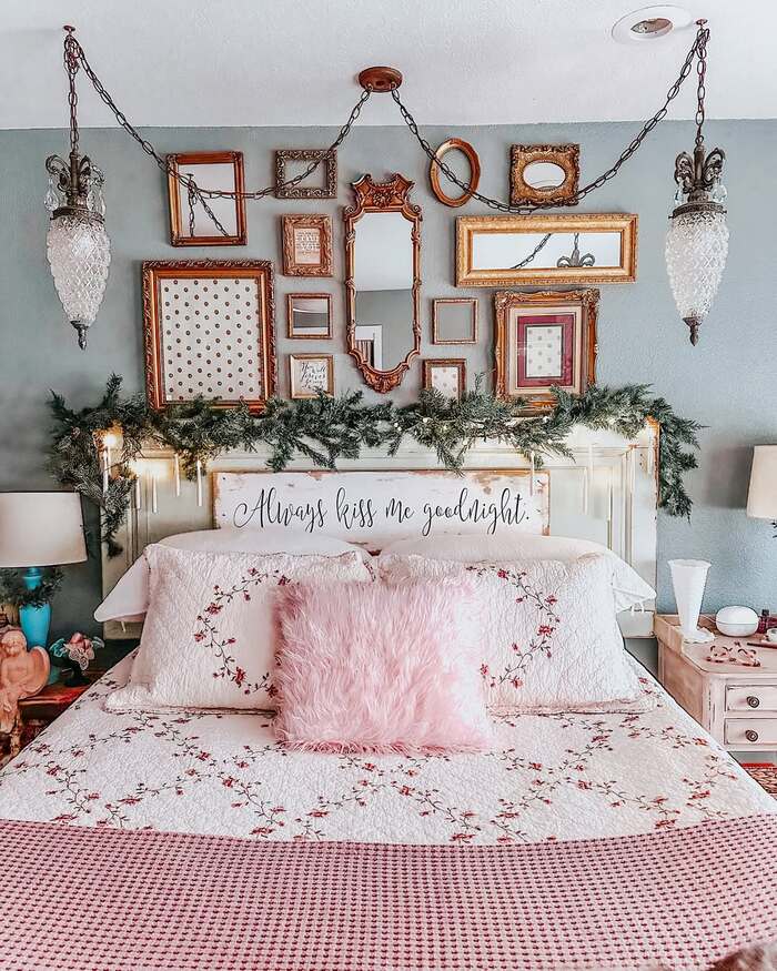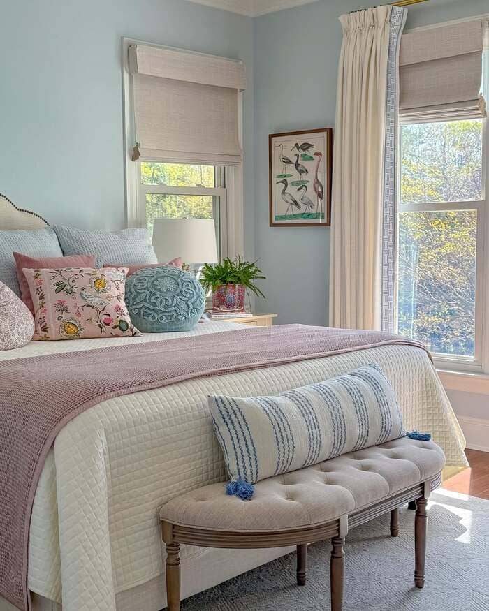 Blue walls, white quilt, blush throw, mixed floral pillows. This is the coastal cousin of pink, very fresh. Blue and pink together feel like sky at sunset, can’t go wrong. Keep hardware warm brass so the scheme doesn’t tilt cold.