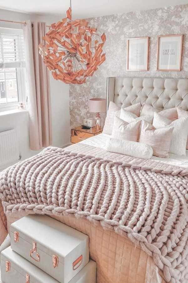 This one screams hug me. Tufted headboard, mirrored nightstand, and a wild pendant like a copper dandelion. The star is the jumbo knit blanket. Texture is doing eighty percent of the work here.