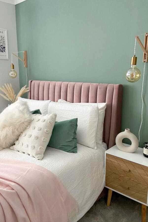 Dusty green wall, pink channel headboard, crisp white bedding. Chef’s kiss. Green cools pink right down and keeps it from going too candy. Add a velvet pillow and a fluffy Mongolian-style one for play. Wood nightstand with chevron drawer front brings back the earthy note.