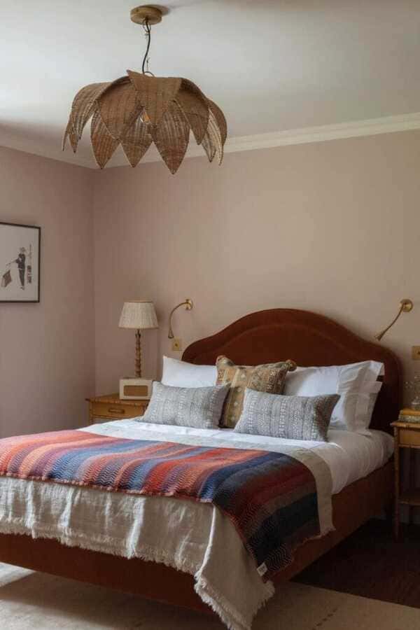 Mauve walls plus a rattan petal pendant makes the room feel like a late summer sunset. On the bed, a textured coverlet with a striped throw in rust and blue. Pink loves friends from the desert palette, like clay and sand.