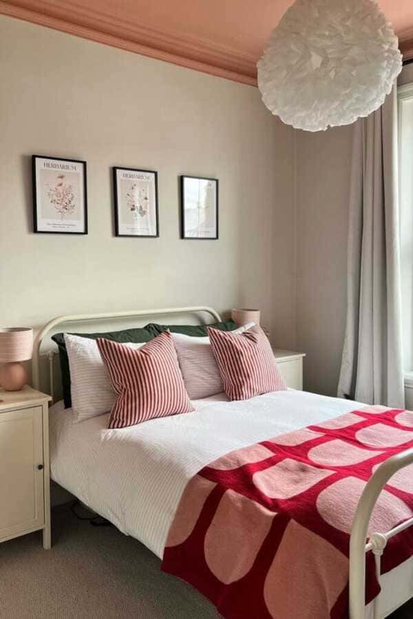 Peachy ceiling, simple iron bed, graphic red and blush throw. The ceiling trick is one I use when walls have to stay rental-beige. It frames the room without touching trim. Keep the bedding quiet, then let two striped pillows and one bold blanket carry pattern.