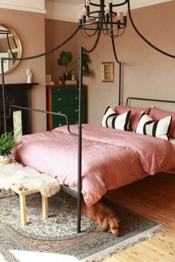 Black canopy lines ground all the pink, which is why I love them so much. Add a classic rug with a million colors and suddenly your pink duvet doesn’t need to match anything. It belongs. If you have pets, choose a duvet with a linen blend, it forgives fur and wrinkles.